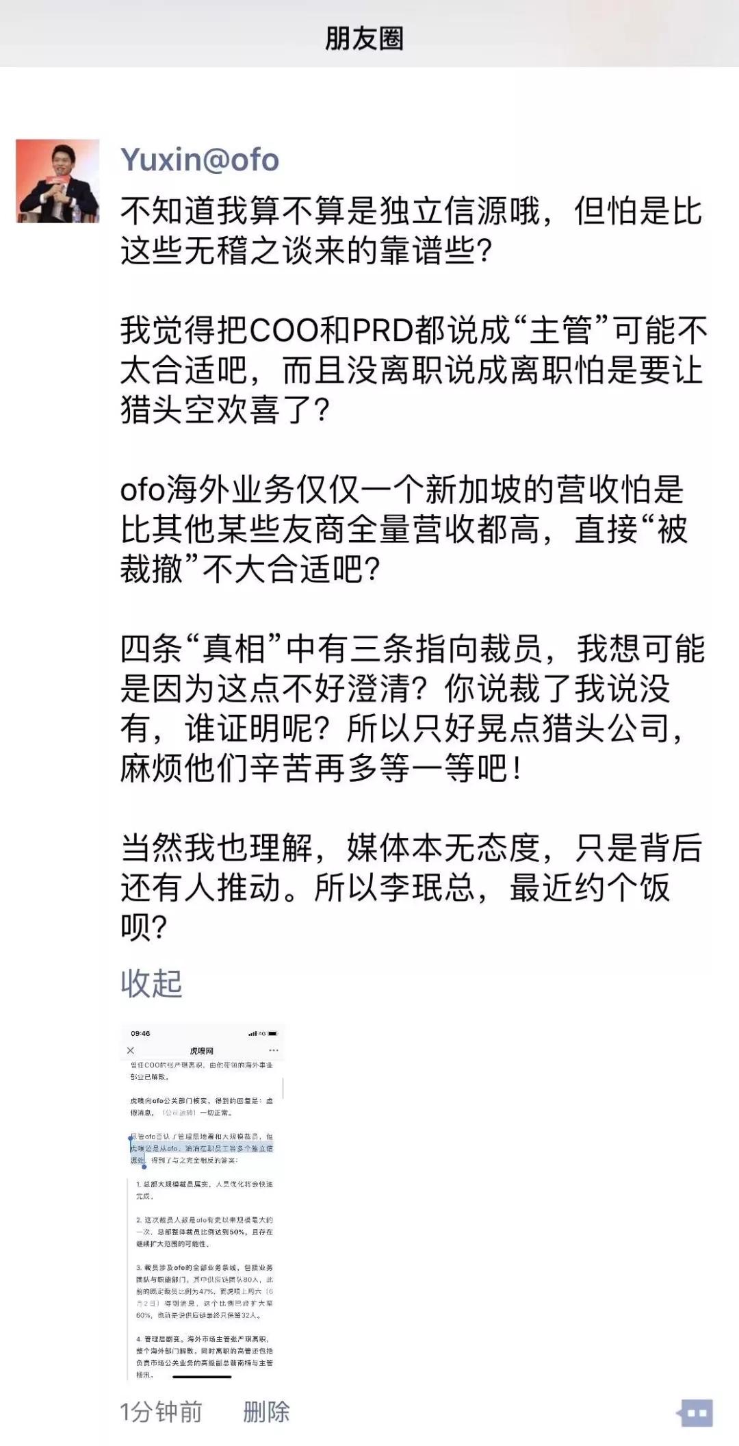 ofo联合创始人于信中午10点在朋友圈中反驳称“无稽之谈”,并称“背后有人推动”。ofo公关向寻找中国创客(ID:xjbmaker)表示,于信朋友圈中的发言就是回应,ofo官方没有其他的口径。