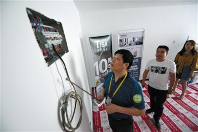 从该工地开关盒内看到,电线分色,电线已做好端子保护,强电管上两个管卡之间平均值为60厘米左右,实现了国家标准,便于以后做吊顶工序。并在墙内有电线、水管的地方用红色贴纸提示,内有水电管线,请文明施工。监理提醒,如果业主需要将柜子靠墙放,并希望柜体和墙体或是天花板之间没有缝隙,那施工人员需要注意提前告知业主在放置柜子的部分不用安装踢脚线或是石膏线。