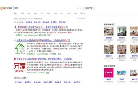 而搜狗搜索“装修”、“保健品”等关键词,发现并没有相关广告标识的搜索结果,但是,以“装修”关键词为例,位列搜索结果第一、二位的是“一起装修网”、“华夏装饰网”,上述网站皆是公司网站。