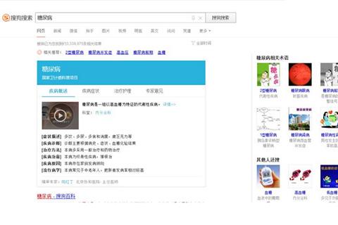 今日晚间,记者在搜狗搜索上搜索“高血压”、“糖尿病”等关键词时,排在前面的为该病种的介绍和百科,并未发现相关广告推荐内容。
