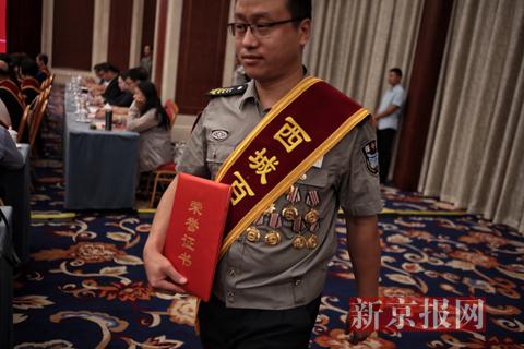 一名受到表彰的保安领取了获奖证书。