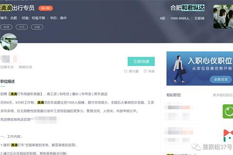 BOSS直聘网站上,昆山和君纵达数据科技有限公司(以下简称“和君纵达”)大量招聘滴滴客服,工作地点为合肥,称“年底滴滴项目要达到1500人规模”,岗位工作内容为“接听‘滴滴打车’全国乘客的来电,解答乘客的咨询;通过后台及相应的权限,帮助乘客解决问题;”还表示“没有压力、上手快,没有经验要求,接受实习生/应界毕业生。”