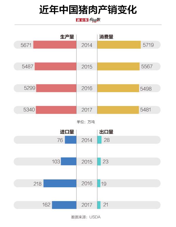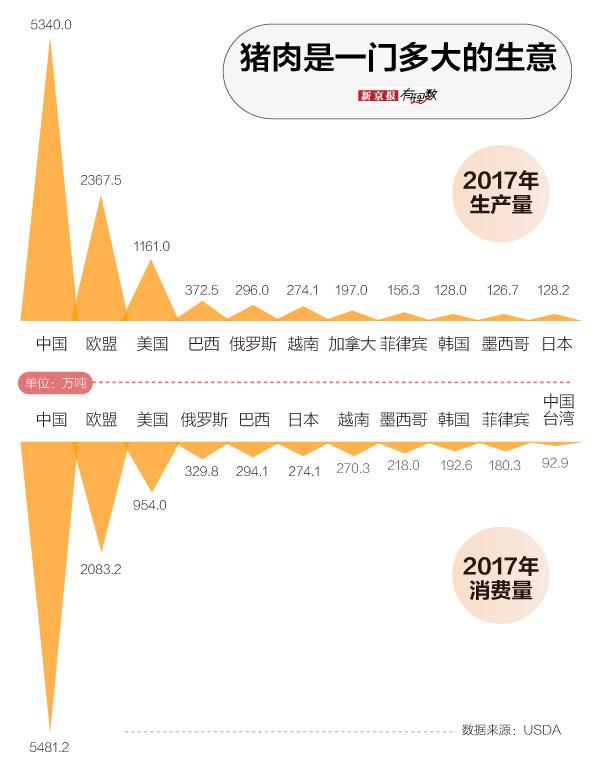 虽说中国消费者对猪肉的热情在一点点减退,但从全球的角度来看,中国仍是猪肉生产和消费大国。根据美国农业部相关报告,2017年,中国一共生产了5340万吨猪肉,是欧盟的2.3倍,美国的4.6倍;同年,中国一共消费了5481.2万吨猪肉,是欧盟的2.6倍,美国的5.7倍。