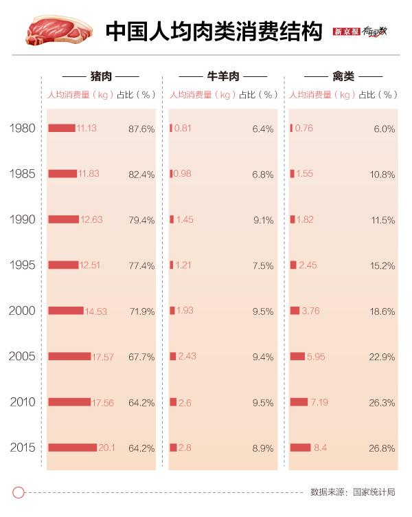 这一现象,与我国肉类消费的日益多元化息息相关。国家统计局相关数据显示,在20世纪80年代,我国猪肉的人均消费量占整体肉类消费的80%以上,到了2015年,这一数字已经下降到64.2%。