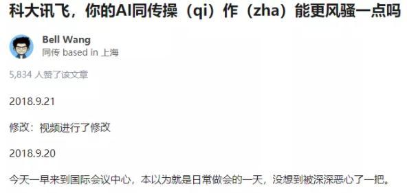 9月20日,用户名为“Bell Wang” 的王同学在某知识问答平台上发表《科大讯飞,你的AI同传操(qi)作(zha)能更风骚一点吗》一文,吐槽了自己“被 AI”的经历。