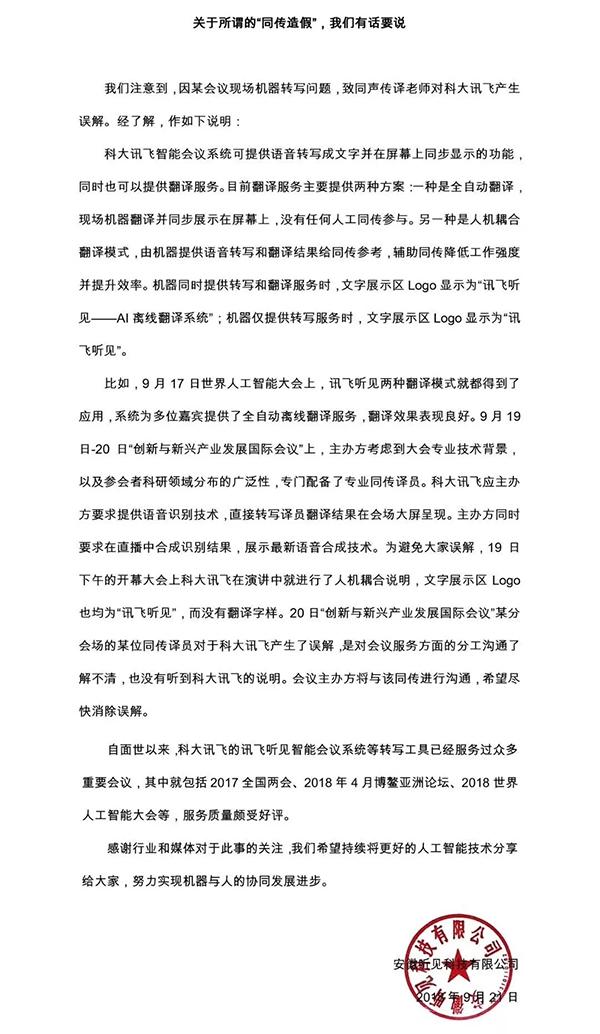 21日下午7时许,科大讯飞作出回应:考虑到专业技术背景及口音等原因,这次2018创新与新兴产业发展国际会议,科大讯飞只提供会议转写上屏服务,并未提供翻译服务。至于转写译员翻译结果并在会场大屏呈现、在直播中合成识别结果,皆是“应主办方要求”。