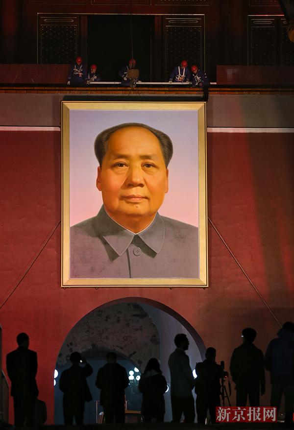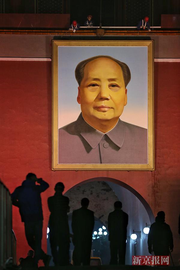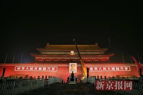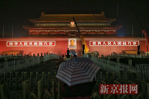 新京报快讯 2018年9月27日晚,为了迎接国庆,天安门城楼换上了新的毛主席像。晚上11点02分,细雨中,一辆吊车和一辆运载着毛主席新画像的货车,从天安门城楼中间门洞驶出。两车停稳后,悬挂了一年的毛主席旧画像被吊车吊起,缓缓摘下。随后,吊车将新画像吊起替换,整个安装过程约一小时。