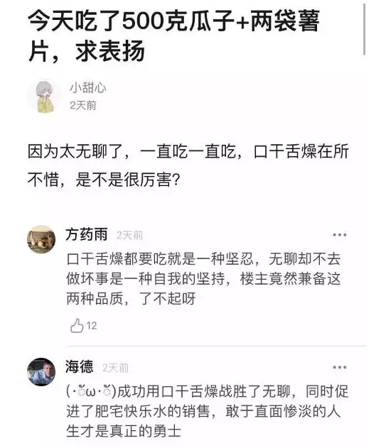 在豆瓣这个小组里,每个发言的人都能享受到这种粉丝对待爱豆级别的待遇。无论你说什么,即便只是吃了500克瓜子,炸焦了4根火腿肠,买东西被骗,刷了一天的题……通通都能收到一堆表扬。