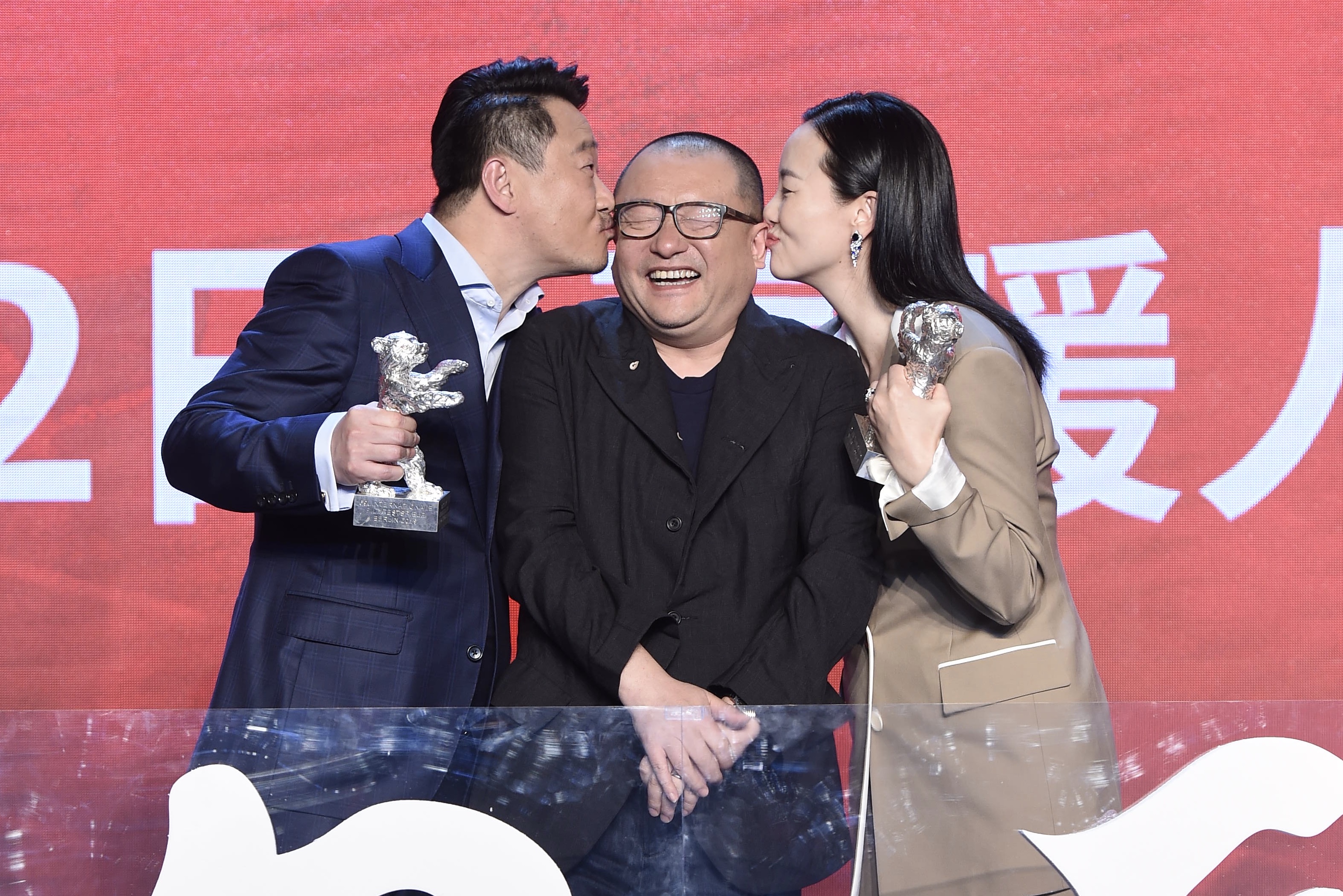 手握柏林银熊奖的王景春、咏梅拥抱导演王小帅。摄影 新京报 郭延冰