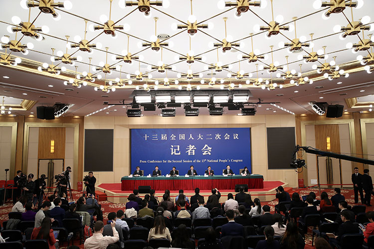 新京报讯 3月10日15时,十三届全国人大二次会议新闻中心在梅地亚中心新闻发布厅举行记者会,邀请全国人大监察和司法委员会副主任委员徐显明、全国人大财政经济委员会副主任委员尹中卿、全国人大教育科学文化卫生委员会副主任委员吴恒、全国人大环境与资源保护委员会副主任委员窦树华和全国人大常委会预算工作委员会副主任朱明春就“人大监督工作”相关问题回答中外记者提问。