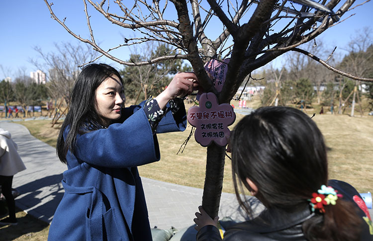 樱花树悬挂文明赏花提示牌“不攀爬不摇树”。