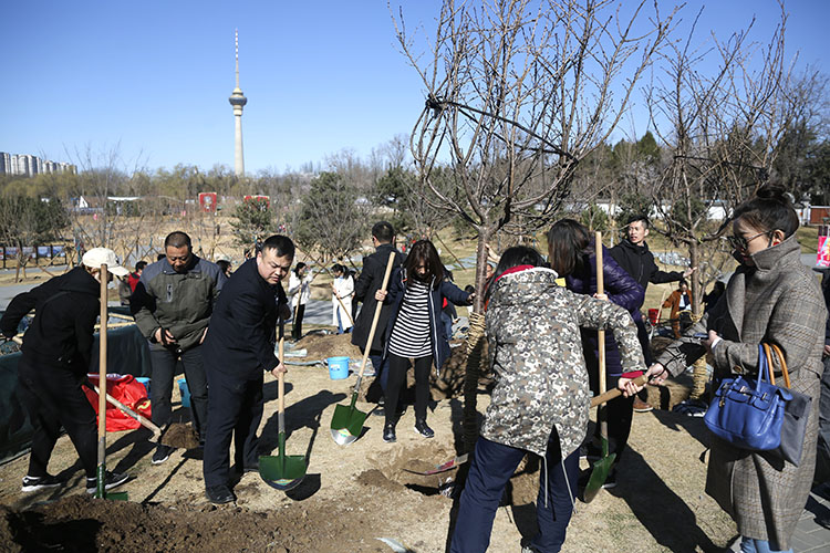 在公园“樱落花谷”景区,游客、志愿者与工作人员一起栽植樱花、连翘、丁香、紫薇等。