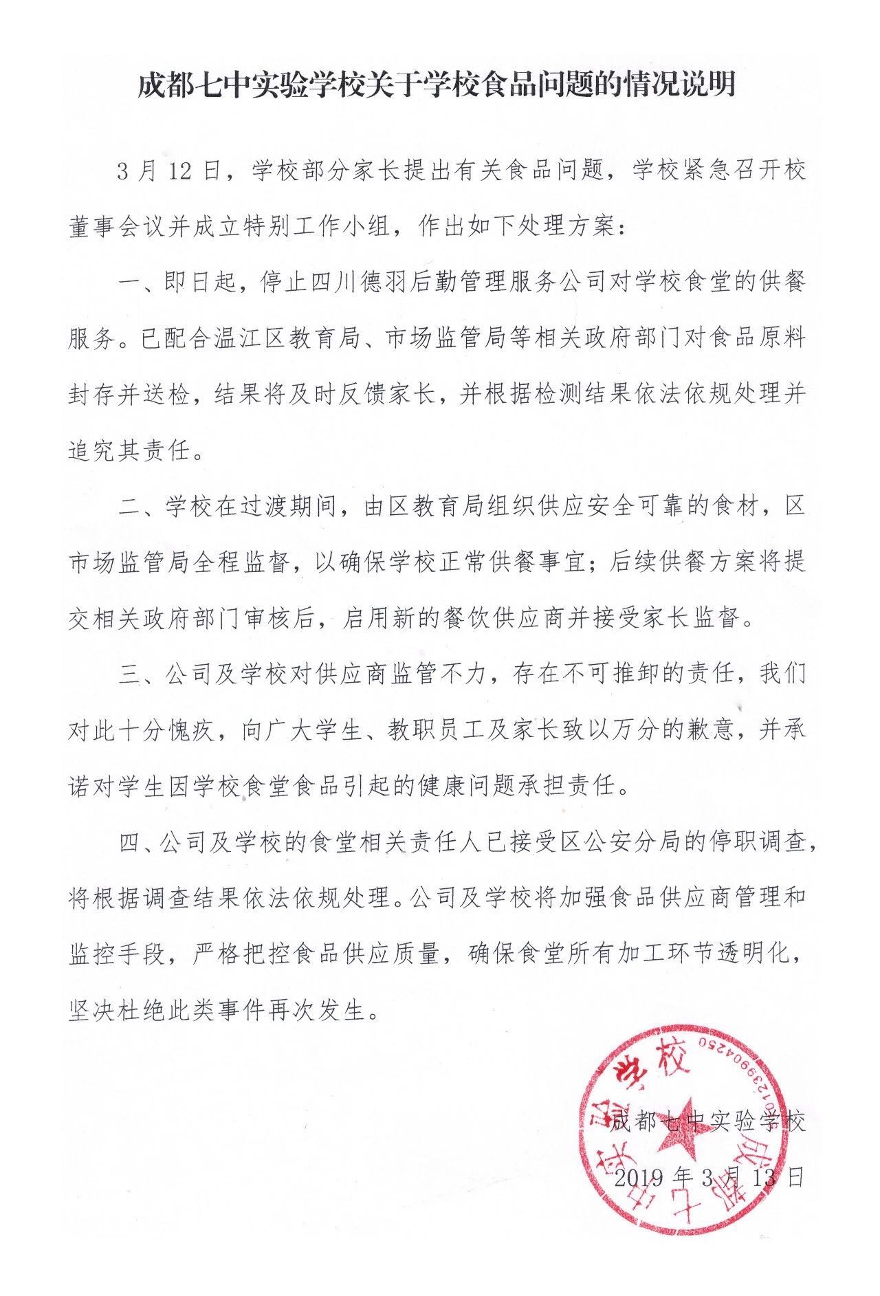 成都七中实验学校:公司及食堂相关责任人已停职调查