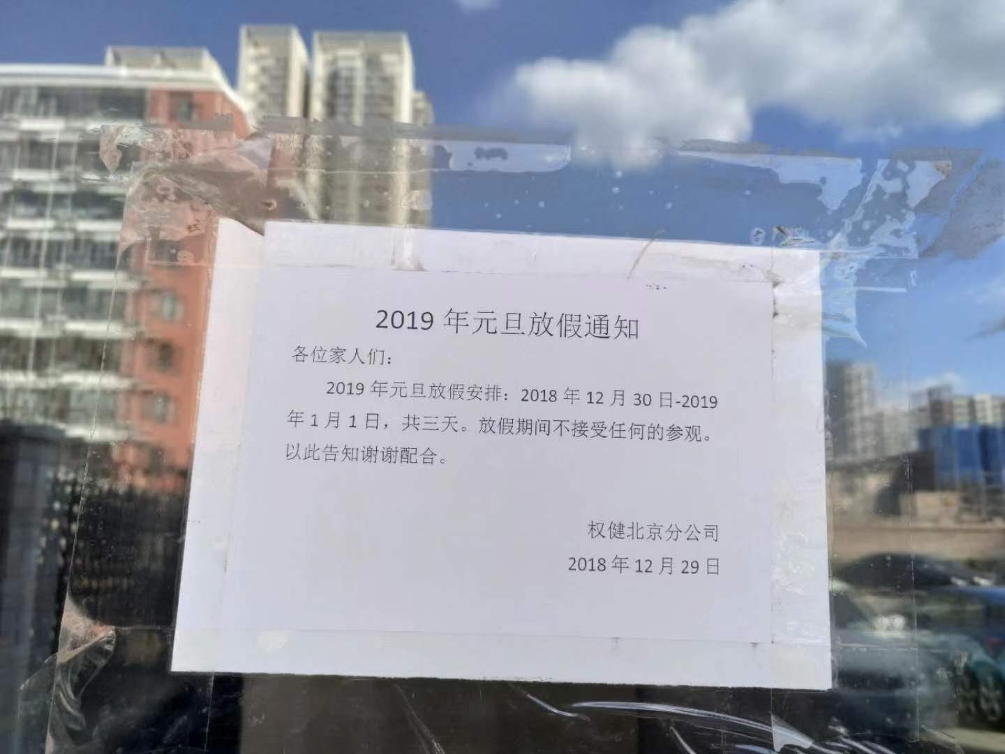 新京报记者注意到,权健北京分公司的玻璃门上张贴着一份“2019年元旦放假通知”,落款为权健北京分公司,时间为2018年12月29日。