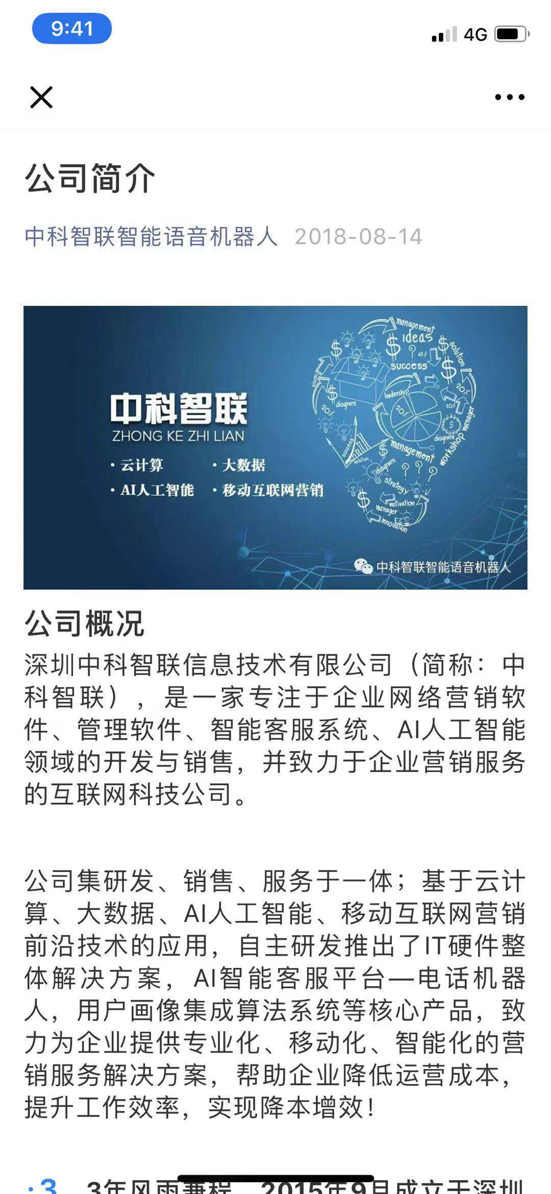 记者查询中科智联微信公众号显示,中科智联是一家专注于企业网络营销软件、管理软件、智能客服系统、AI人工智能领域的开发与销售,并致力于企业营销服务的互联网科技公司。