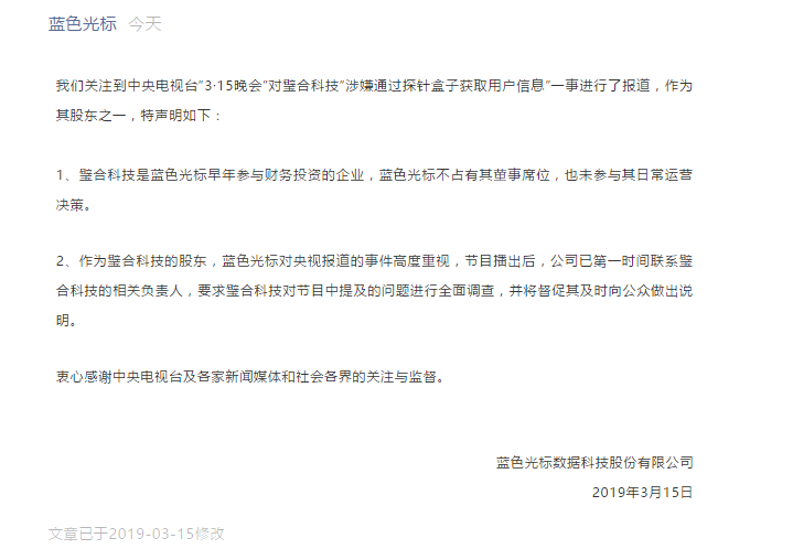新京报快讯 据蓝色光标官方微信消息,蓝色光标关注到中央电视台“3·15晚会”对璧合科技“涉嫌通过探针盒子获取用户信息”一事进行了报道,作为其股东之一,特声明如下: