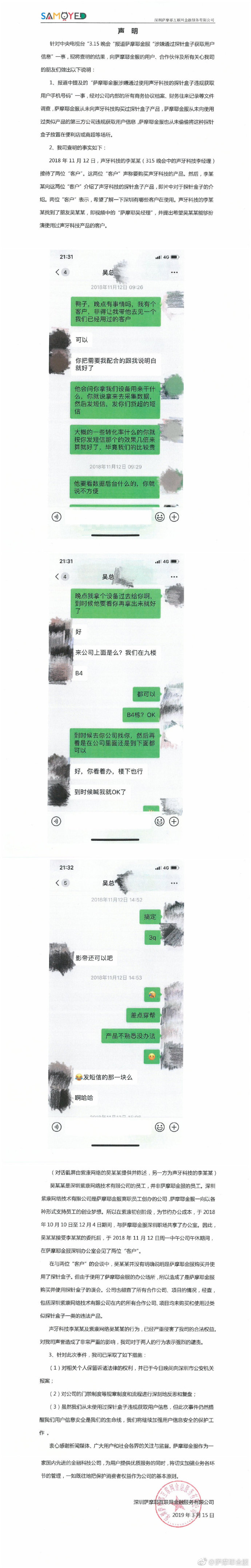新京报快讯 据萨摩耶金服官方微博消息,针对中央电视台“3.15晚会“报道萨摩耶金服“涉嫌通过探针盒子获取用户信息”一事,现将查明的结果,做出以下说明:
