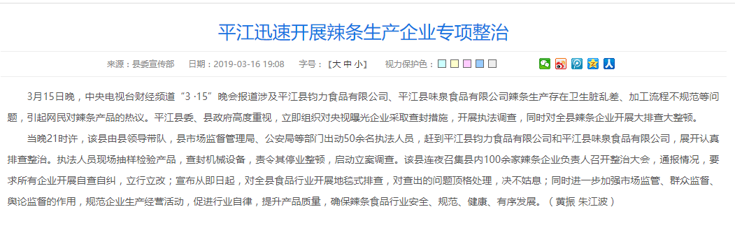新京报快讯 据湖南省平江县人民政府官网消息,3月15日晚,中央电视台财经频道“3 ·15”晚会报道涉及平江县钧力食品有限公司、平江县味泉食品有限公司辣条生产存在卫生脏乱差、加工流程不规范等问题,引起网民对辣条产品的热议。平江县委、县政府高度重视,立即组织对央视曝光企业采取查封措施,开展执法调查,同时对全县辣条企业开展大排查大整顿。