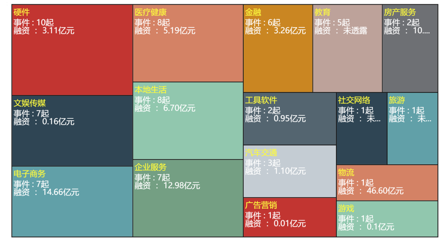 从融资金额来看,物流行业是融资金额最多的行业(仅对公开了融资数据的事件进行统计),共计46.6亿元,其次是电子商务,融资金额为14.66亿元。
