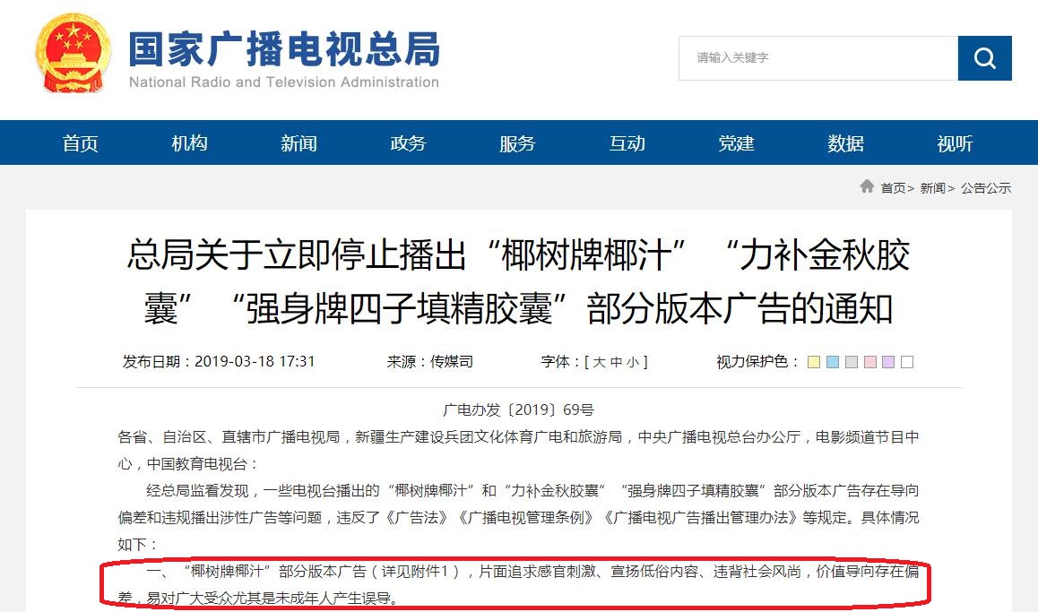 为严肃播出纪律,维护人民群众合法权益,广电总局决定,自即日起,各级广播电视播出机构立即停止播出相关版本的“椰树牌椰汁”“力补金秋胶囊”和“强身牌四子填精胶囊”广告,并举一反三,全面清查所有在播和拟播广告,严把导向关,凡存在类似违规问题的,一律禁止播出,坚决杜绝此类违规问题。