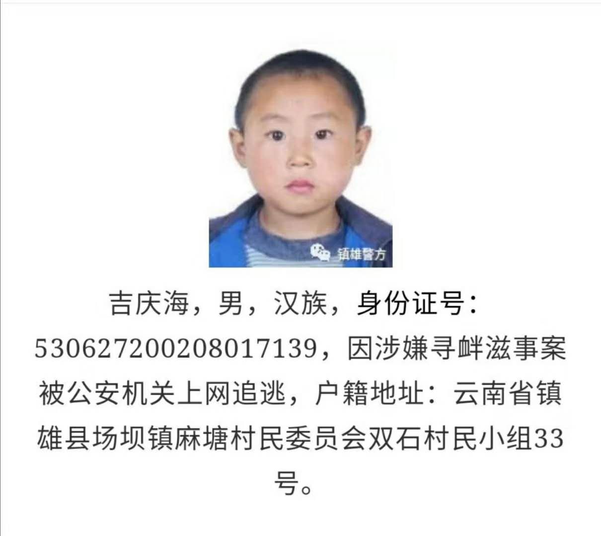 新京报讯(记者 吴荣奎 张熙廷)3月19日,云南镇雄警方发文悬赏通缉百名在逃犯罪嫌疑人,其中嫌疑人吉庆海的身份证号为“530627200208017139”,对应的照片则为一张孩子照片。 镇雄县公安局政工室回应称,该嫌疑人“犯事”后一直外逃,该照片系其几年前所拍,因警方没有找到该嫌疑人最近时间段拍摄的以及“犯事”时的照片,用这张照片实属无奈之举。