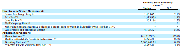 携程最新股权:百度持股降至19% 梁建章增至2.1%