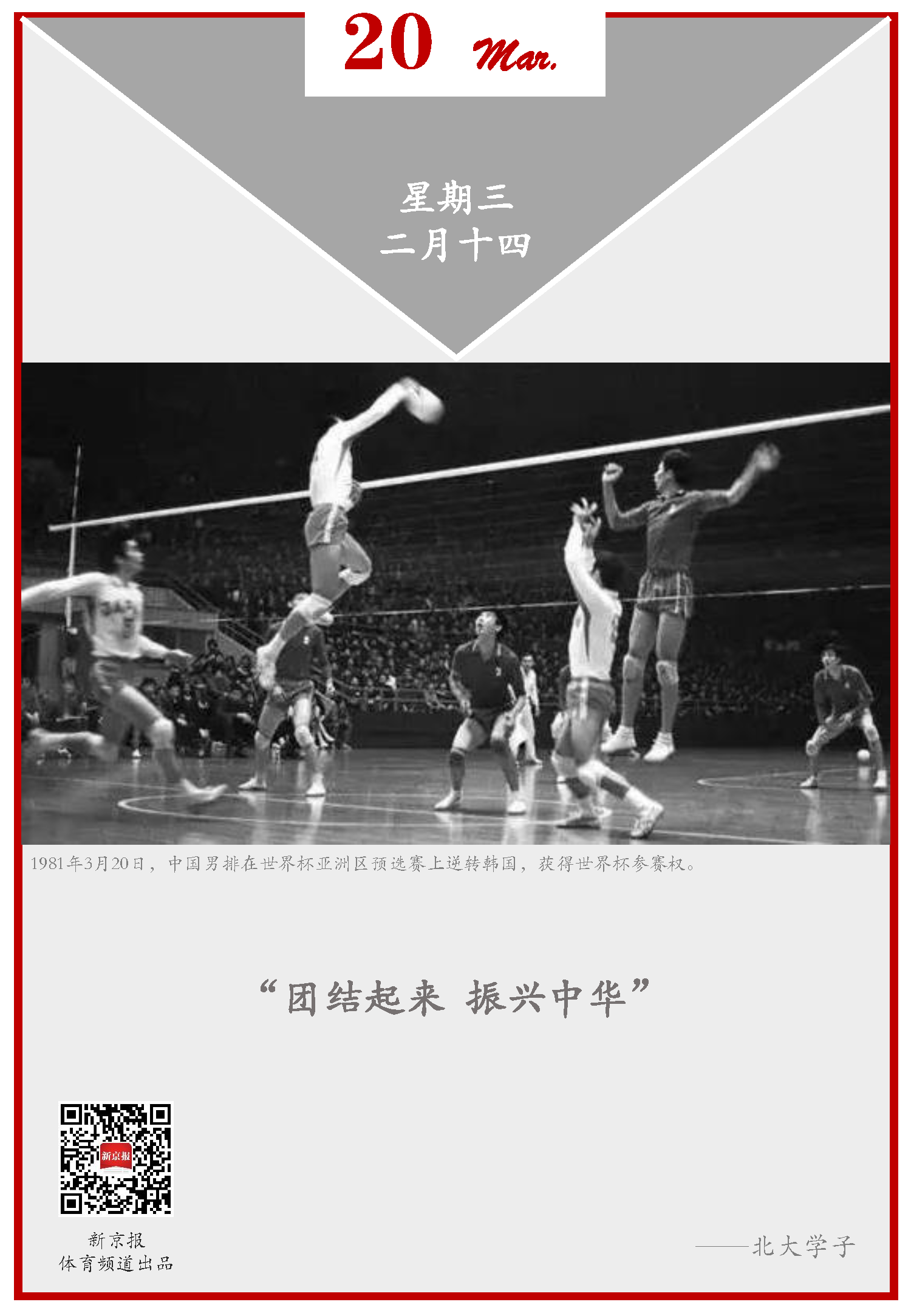 北大学子在“3·20之夜”彻夜游行,并喊出“团结起来,振兴中华”的口号,为中国男排的胜利欢呼。后来,这也成为激励一代人奋发图强的战斗号角。