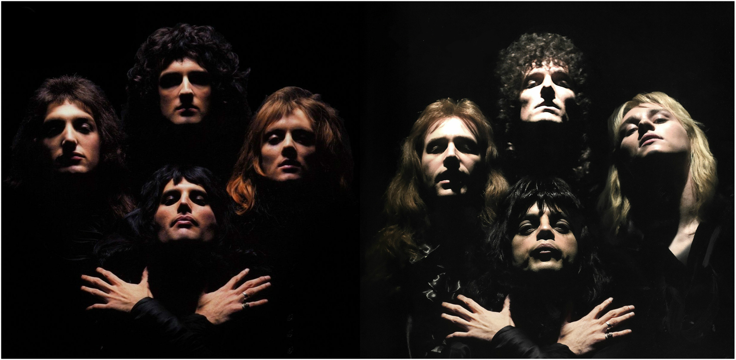 左右分别为现实和电影中的“皇后乐队”队员合影。