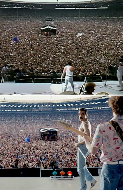 上下图分别为现实和影片中的“Live Aid”摇滚演唱会。