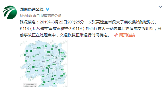 新京报快讯 据湖南省高速公路集团有限公司官方微博发布路况信息,2019年3月22日20时25分,长张高速益常段太子庙收费站附近以东K118(后经核实事故点桩号为K119)处西往东因一辆客车自燃造成交通阻断,目前事故正在处理当中,交通恢复正常通行时间待定。