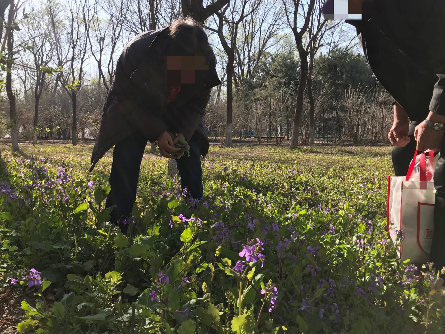 记者在多个公园探访发现,游客采挖野菜的现象十分普遍。上周日(3月24日)一早,奥林匹克森林公园迎来了大批晨跑的市民。还在早春时节,土地尚未完全返青,但在公园内,耐寒的二月兰已成片长生,郁郁葱葱,有游客凑上前去拍照,也有一部分游客拿好了袋子,准备对二月兰“下手”。