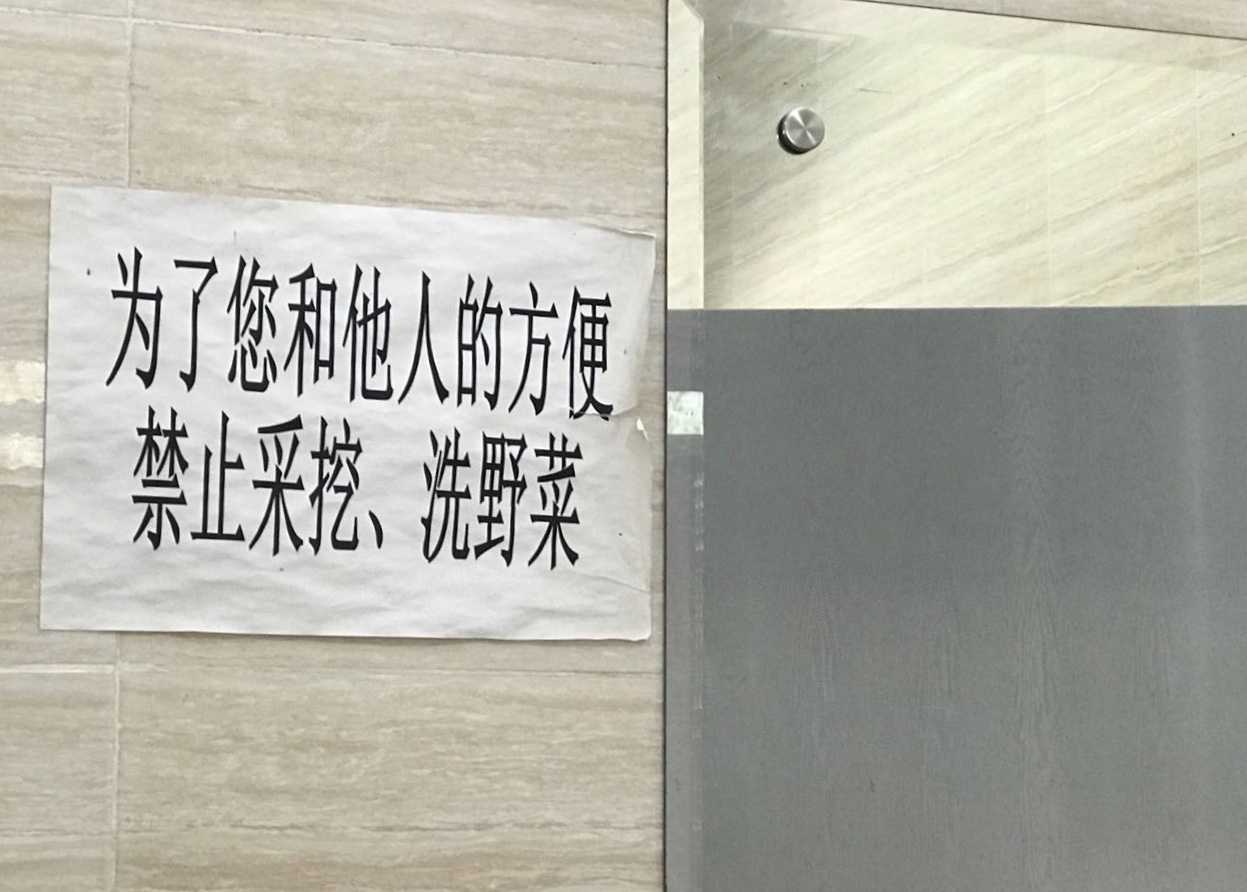 公园的公共卫生间里,有市民在清洗刚刚挖好的野菜。记者在卫生间内看到公园贴出的告示:为了您和他人的方便,禁止采挖、洗野菜。