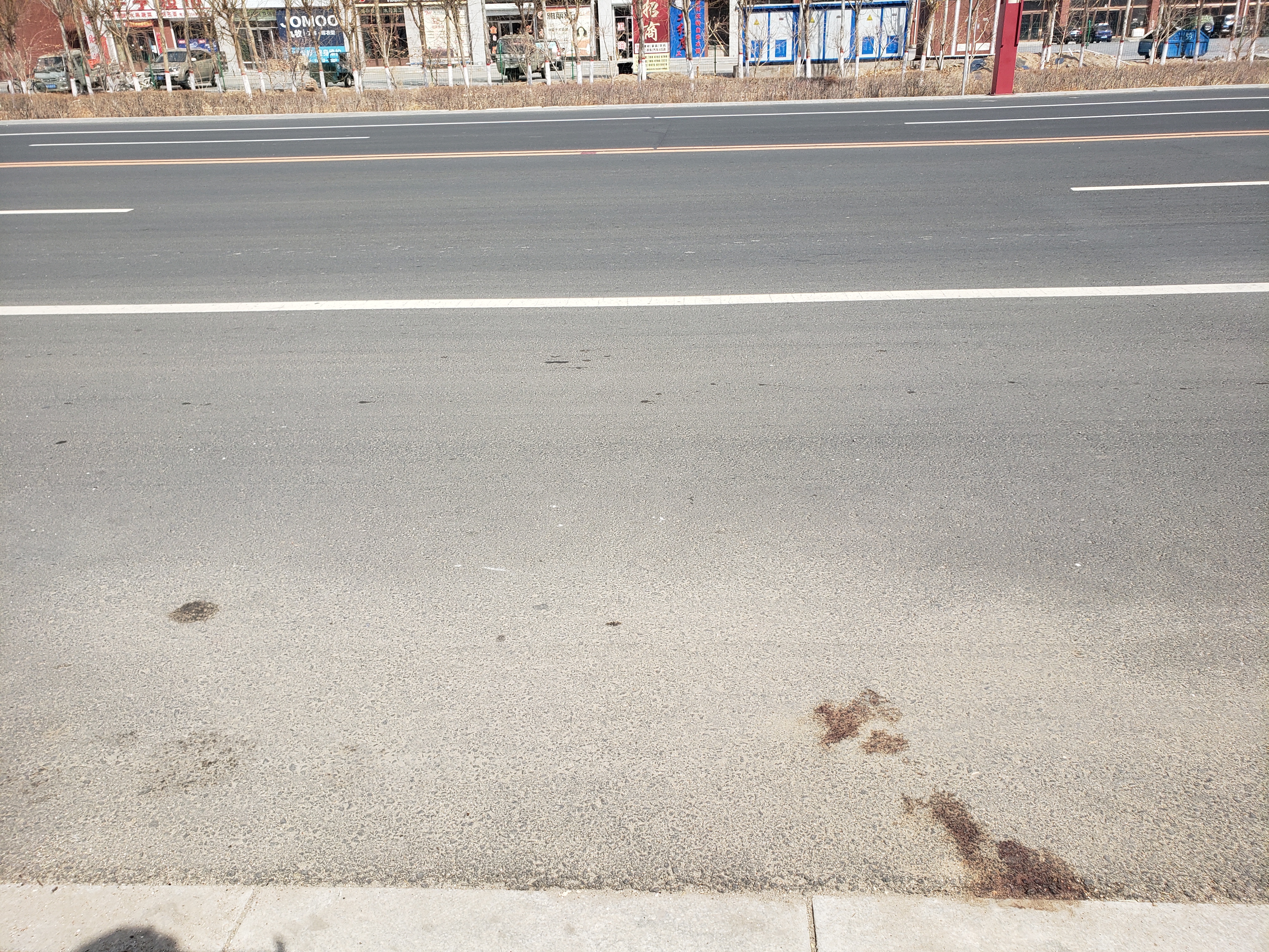 新京报记者重访了这处行凶点。宽阔的马路上,车辆和大风一道呼啸而过。在马路与步行道的交界处,残留着几块并不显眼的血迹。
