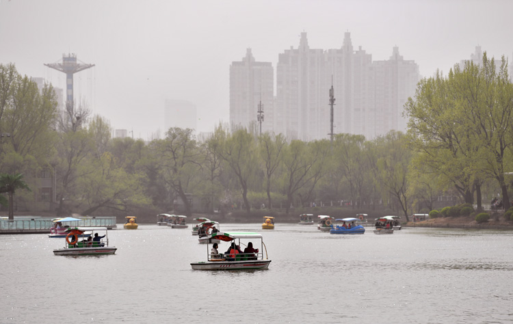 在朝阳公园,游船遍布湖面。