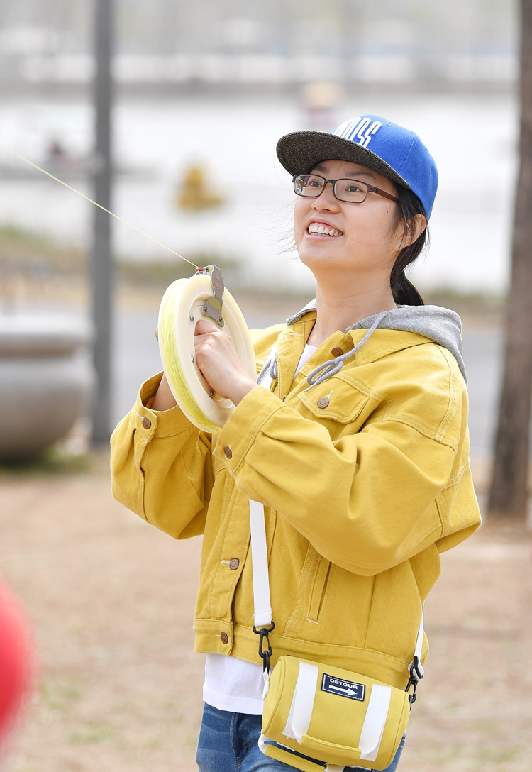 一位姑娘在心无旁骛地享受放风筝的乐趣。