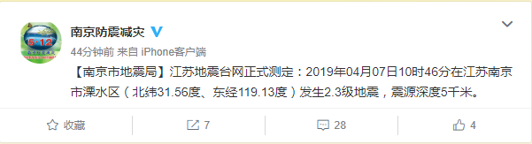 新京报快讯 据江苏省南京市地震局官方微博4月7日消息,江苏地震台网正式测定:2019年4月7日10时46分在江苏南京市溧水区(北纬31.56度、东经119.13度)发生2.3级地震,震源深度5千米。
