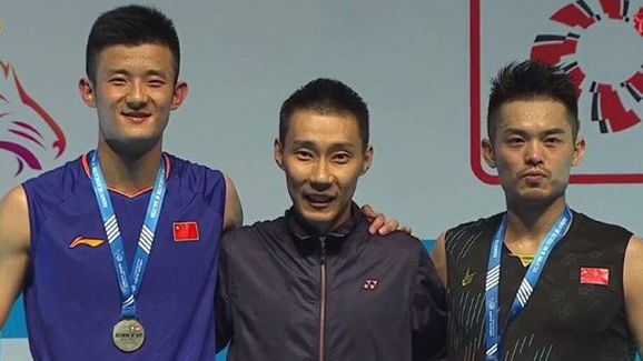 颁奖嘉宾李宗伟与冠亚军林丹、谌龙同框。