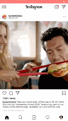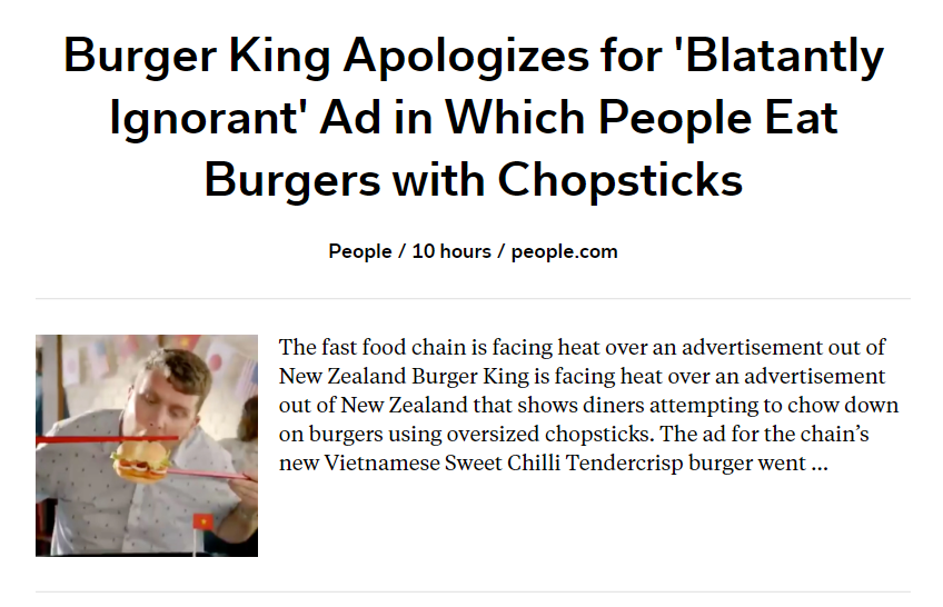 据外媒报道,汉堡王为在新西兰推广新品“越南甜辣嫩脆堡”,在社交媒体Instagram上发布了一段广告短片,片中一“顾客”手握巨型筷子吃汉堡,动作笨拙,配上的广告词则为“带着你的味蕾一路来到胡志明市,品尝我们的越南风味甜辣嫩堡,这是我们全球风味的一部分。”