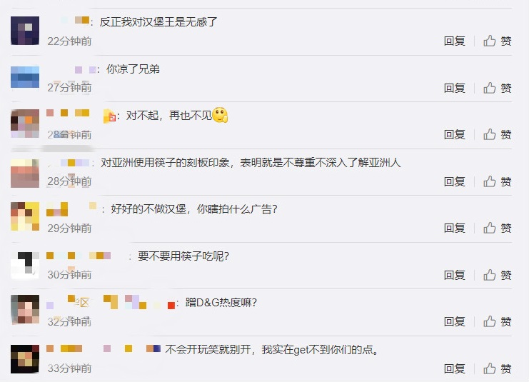 此后,这段广告引发网友的强烈不满,认为视频中用筷子吃汉堡的动作,让筷子这一亚洲餐具看起来“笨拙”“低级”和“愚蠢”,海内外网友指责汉堡王“对文化不敏感”和“种族歧视”。也有网友将此事与去年意大利奢侈品牌杜嘉班纳(D&G)的“筷子风波”联系在一起,认为汉堡王没有吸取杜嘉班纳招致中国民众的反感与抵制的教训。