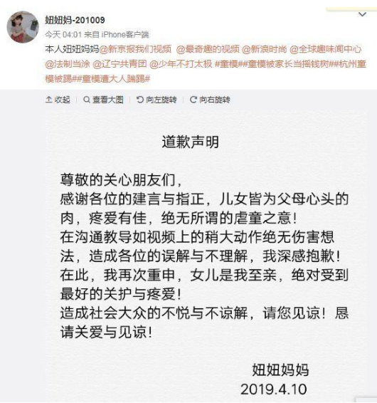 踹小孩的女童母亲,很快站出来向公众道歉。她称“绝无虐童之意,只是在沟通教导中如视频所示动作稍大,绝无伤害之意。”