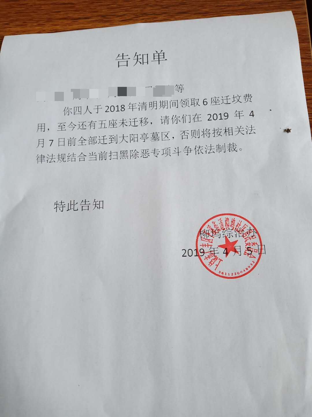 4月5日,周卫虎接到柳坞社区综治办发送的告知单。告知单显示,周卫虎几兄弟于2018年清明期间领取了6座坟的迁坟费,但至今仍有5座未迁移,综治办要求需在4月7日前全部迁移完毕,“否则将按相关法规结合扫黑除恶专项斗争依法制裁”。