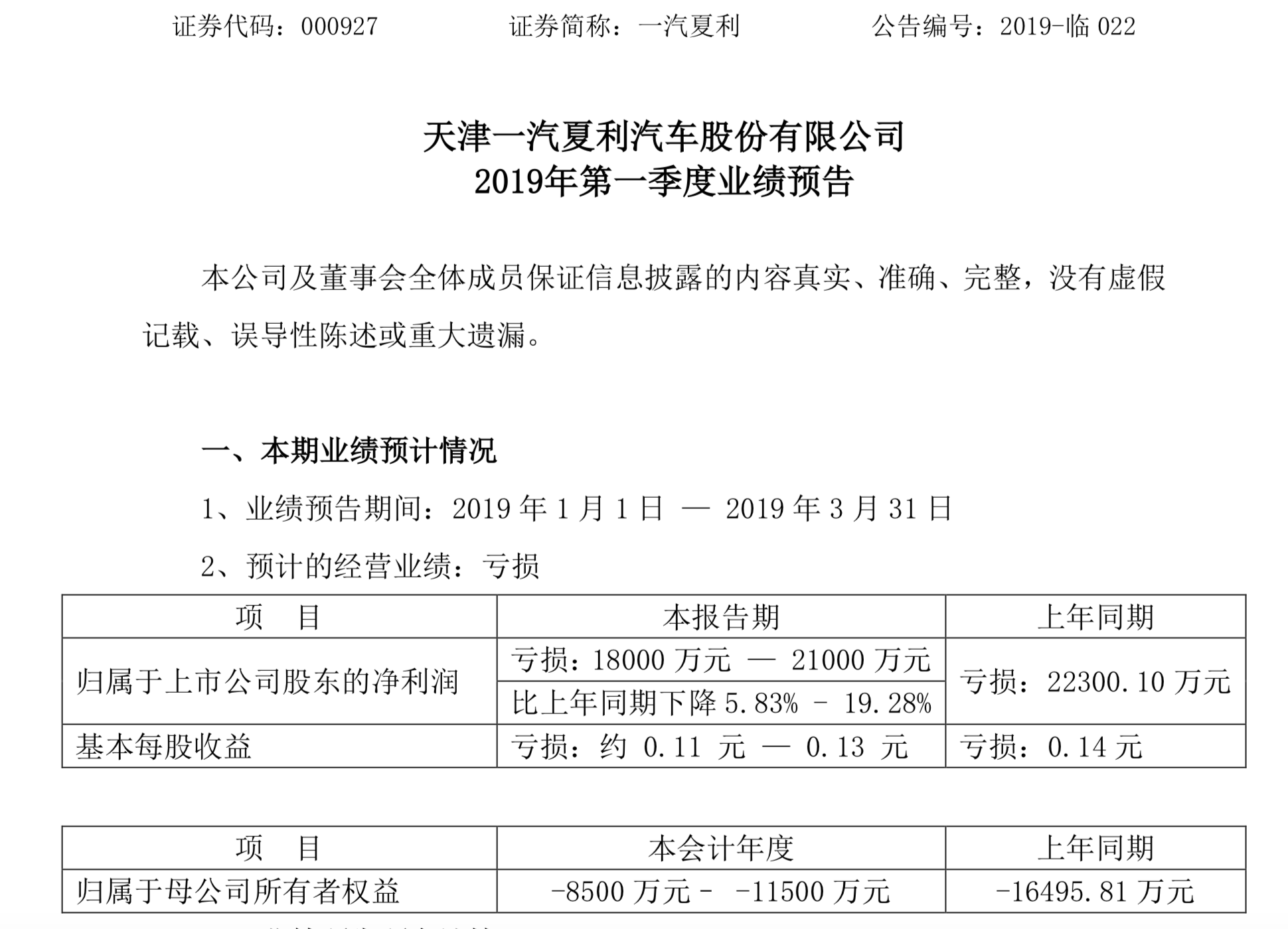 新京报快讯(记者 王琳琳)天津一汽夏利汽车股份有限公司(简称“一汽夏利”)披露了2019年第一季度业绩预告,2019年第一季度归属于上市公司股东的净利润呈现亏损状态,预计亏损1.8亿元-2.1亿元,与去年同期相比下降5.83%-19.28%。