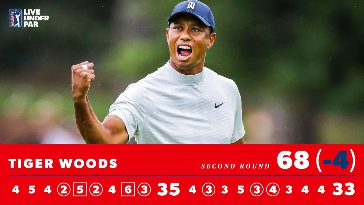 继首轮打出70杆(-2)之后,伍兹第2轮持续降低着自己的总杆数。前9洞伍兹收获3鸟2柏忌,转场后,43岁的老虎让人们看到了他巅峰时的眼神和状态,后9洞抓到3只小鸟,交出68杆(-4),伍兹的总成绩来到低于标准杆6杆,冲上并列第6名,距领先者只有1杆之差。
