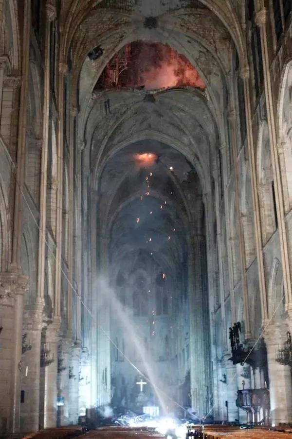 巴黎圣母院的主体结构得到了保存,包括两座塔楼和建筑四周的石制结构。但由于屋顶是木质结构,过火面积超过三分之二,大部分已经向下坍塌。目前已经有消防员进入教堂内部拍到照片,可以看到内部的结构还相对完整,只是屋顶部分坍塌。
