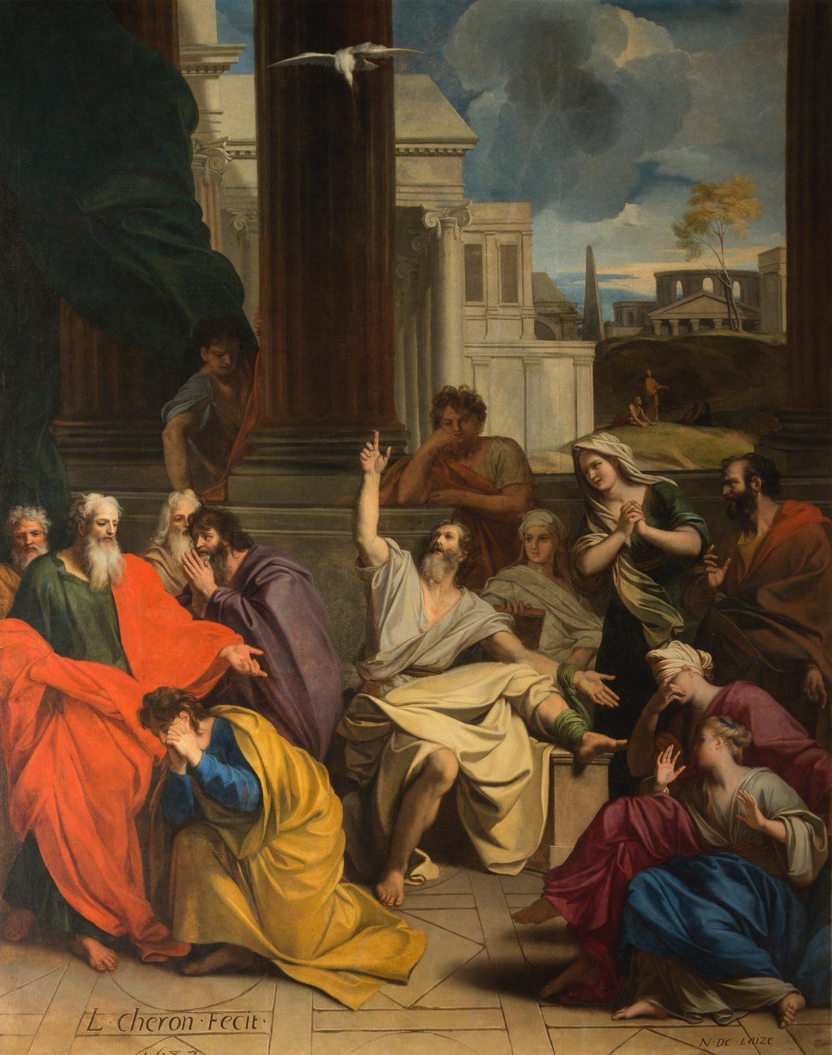 圣托马斯·阿奎那是一位中世纪经院哲学家,同时也是一位圣人。在这幅由Antoine Nicolas 于1648年所作的画中,他坐在画面中心的底座上,被其他渴求知识的人围绕。