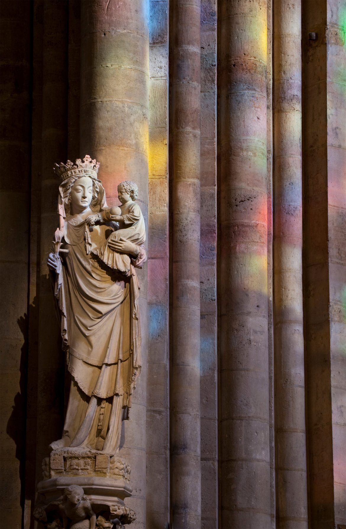 巴黎圣母院中的标志性雕像便是位于教堂中与大堂十字交叉的耳堂中的圣母雕像。自12世纪巴黎圣母院建成之初,便专门在这里设立了圣母祭坛,这也是巴黎圣母院内37个圣母像中最知名的一个。雕像在14世纪中期完成,于1818年转移至圣母院。