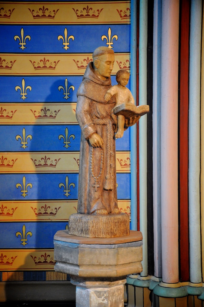 圣安托万在1232年被教皇格里高利九世封圣,是天主教堂最受欢迎的圣人之一。巴黎圣母院的这座圣安托万雕像位于圣费尔迪南礼拜堂祭台周围的回廊内,圣人手捧圣经和十字架经环,神情专注肃穆。