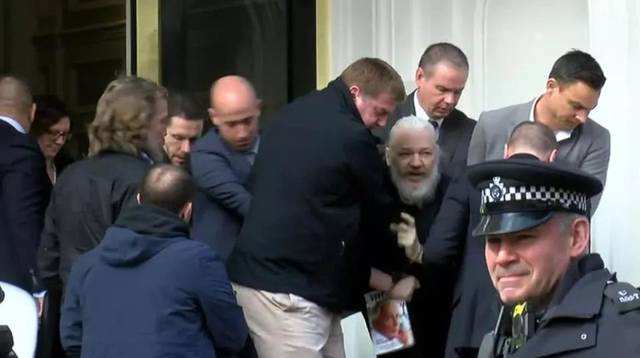 在互联网上,一段网络视频记录下了阿桑奇被抓的情景。满头白发的阿桑奇被至少七个人押解出厄瓜多尔大使馆。在阿桑奇被拖出大使馆时,他情绪激动地大喊着,“英国必须拒绝”。他手里拿着一本戈尔·维达尔的《国家安全的历史》(The History of The National Security State),书中有对美国安全机构的批评。维基解密官方推特发文称,厄瓜多尔取消对阿桑奇的庇护是违反国际法的。随后,阿桑奇被押至伦敦中心警局,等待前往威斯敏斯特地方法院出庭。