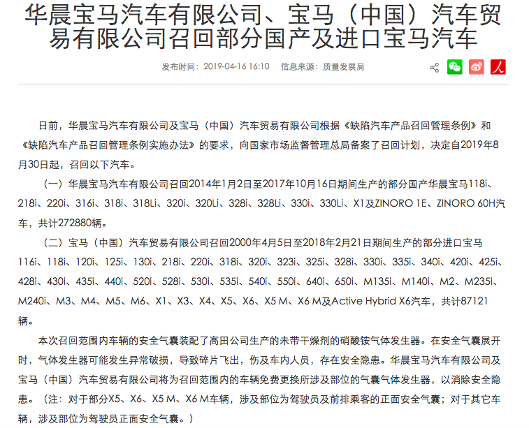 因安全气囊装配了高田公司生产的未带干燥剂的硝酸铵气体发生器,宝马在华召回360001辆汽车。