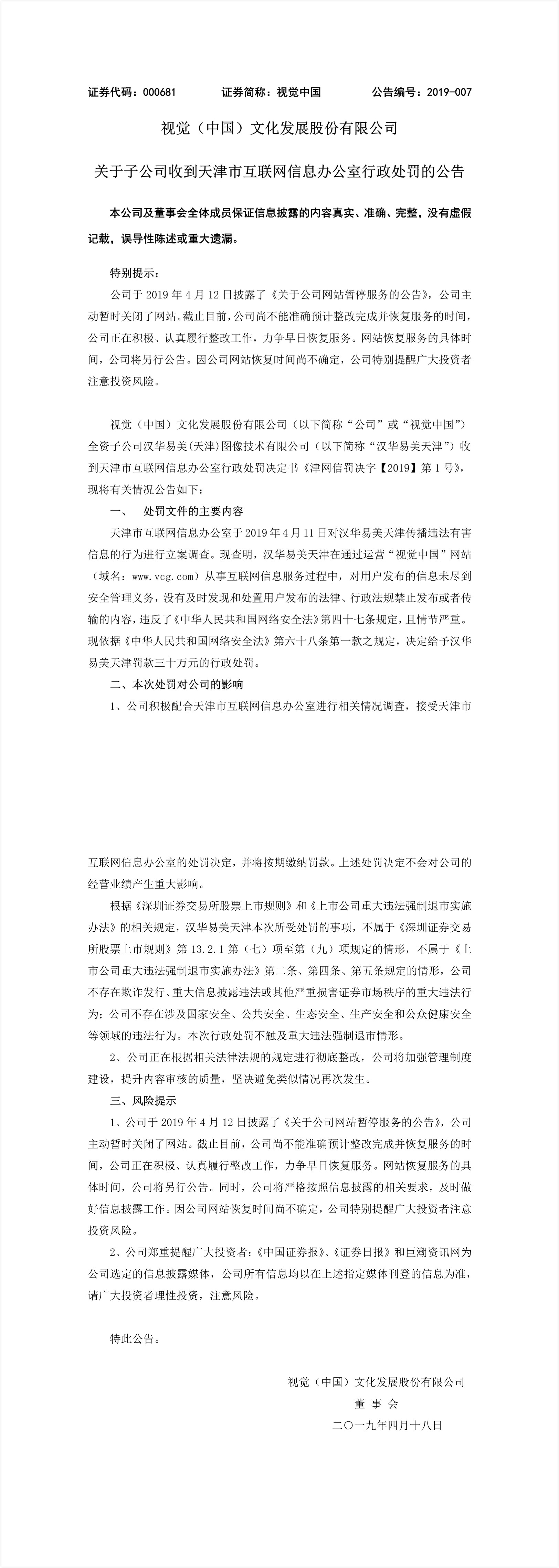 4月18日,视觉中国公告,汉华易美天津在通过运营“视觉中国”网站从事互联网信息服务过程中,对用户发布的信息未尽到安全管理义务,天津市网信办决定给予汉华易美天津罚款三十万元的行政处罚。公司尚不能准确预计整改完成并恢复服务的时间。上述处罚决定不会对公司的经营业绩产生重大影响,不触及重大违法强制退市情形。